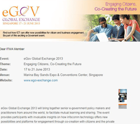 eGov Global Exchange 2013 ITMA Newsletter Dear ITMA Member Event: eGov Global Exchange 2013 Theme: Engaging Citizens, Co-Creating the Future Date: 17 to 21 June 2013 Venue: Marina Bay Sands Expo & Conventions Center, Singapore Website: www.egovexchange.com eGov Global Exchange 2013 will bring together senior e-government policy makers and practitioners from around the world, to […]