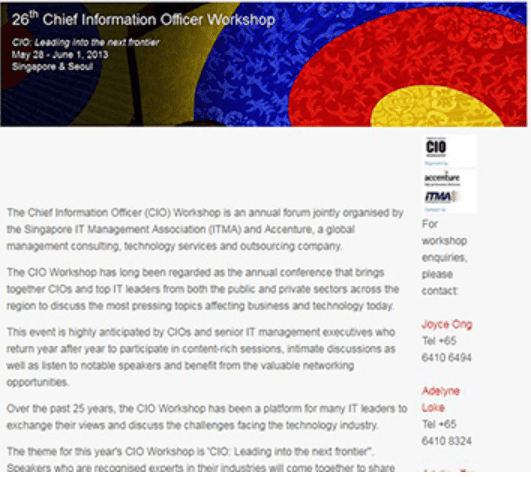 26th Chief Information Officer Workshop The Chief Information Officer (CIO) Workshop is an annual forum jointly organised by the Singapore IT Management Association (ITMA) and Accenture, a global management consulting, technology services and outsourcing company. The CIO Workshop has long been regarded as the annual conference that brings together CIOs and top IT leaders from […]